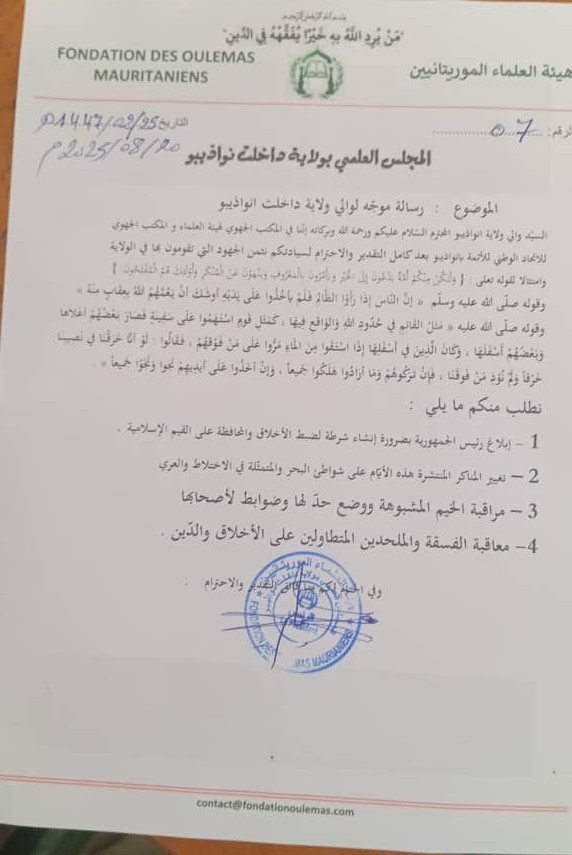 وجاءت هذه الدعوة في رسالة وجهتها الهيئة إلى والي نواذيبو اليوم الأربعاء، دعت فيها إلى التصدي للمظاهر المنافية للقيم الإسلامية المنتشرة مؤخرًا على الشواطئ، مثل الاختلاط والعري.