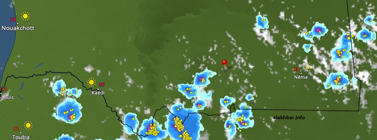 وتمتد موجة السحب الماطرة من الحوض الشرقي وحتى جنوب ولاية البراكنة، وداخل الأراضي السنغالية، وهي سحب ما زالت محدودة الانتشار والكثافة، لكن يتوقع بحول الله تعالى أن تزداد كثافة خلال الساعات القادمة، وأن تغطّي مناطق واسعة من ولايات الحوضين الشرقي والغربي، والعصابة، وكيدي ماغا، وكوركل، وجنوب ولايتي البراكنة والترارزة.