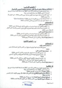 أما شهادة الثانوية العامة “البكالوريا”، فستجرى دورتها العادية أيام 29، 30 يونيو، و1، 2 يوليو 2026، على أن تجرى الدورة التكميلية يومي 3 و4 أغسطس.