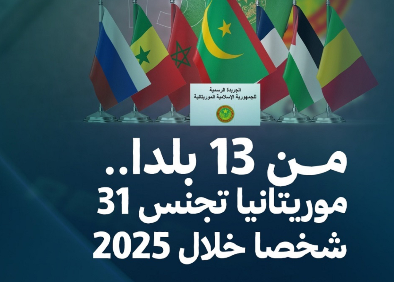 منحت موريتانيا جنسيتها لـ31 شخصا خلال العام 2025، في رقم قياسي مقارنة مع الأعوام السابقة، حيث كان عدد الحاصلين على الجنسية الموريتانية لا يتجاوز أصابع اليد الواحدة.
