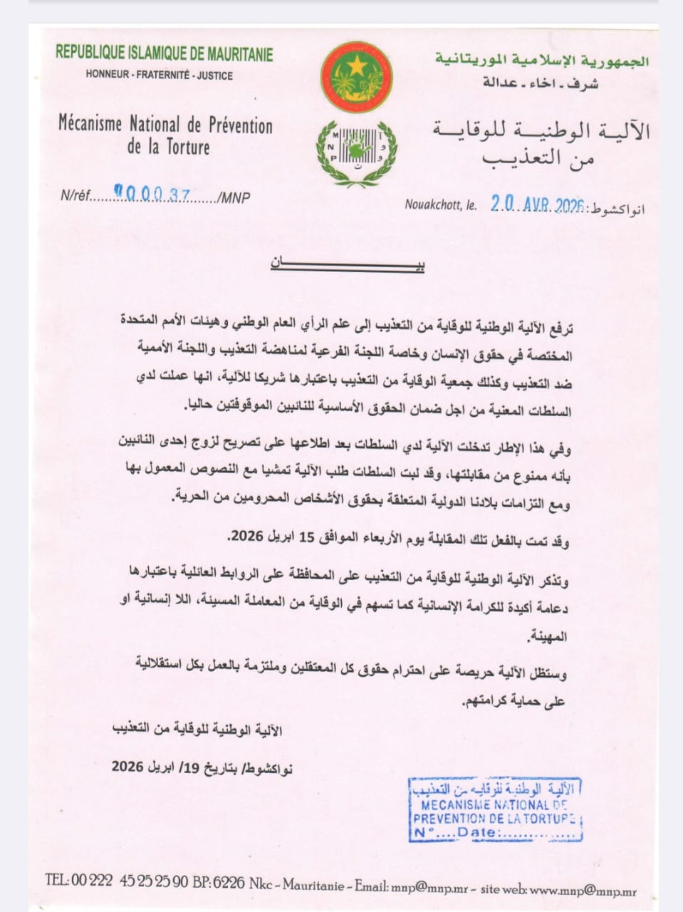 ترفع الآلية الوطنية للوقاية من التعذيب إلى علم الرأي العام الوطني وهيئات الأمم المتحدة المختصة في حقوق الإنسان وخاصة اللجنة الفرعية لمناهضة التعذيب واللجنة الأممية ضد التعذيب وكذلك جمعية الوقاية من التعذيب باعتبارها شريكا للآلية ، أنها عملت لدى السلطات المعنية من أجل ضمان الحقوق الأساسية للنائبين الموقوفين حاليا.