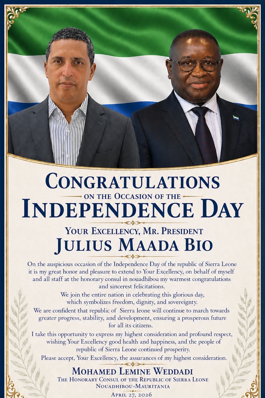 بمناسبة عيد استقلال جمهورية سيراليون، يشرفني ويسعدني أن أتقدم إلى فخامتكم نيابةً عني وعن جميع موظفي القنصلية الفخرية في نواذيبو، بأطيب التهاني و التبريكات .